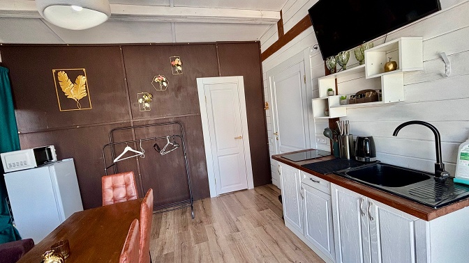 — аренда домика (45 кв. м) со всеми удобствами (1 спальней, мини-гостиной с телевизором, холодильником, микроволновой печью, кондиционером);